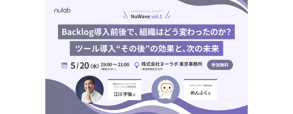 NuWave(ヌーウェイブ)は、ヌーラボ製品(Backlog / Cacoo / Nulab Pass)の導入推進担当者・責任者の皆様を対象としたコミュニティです。